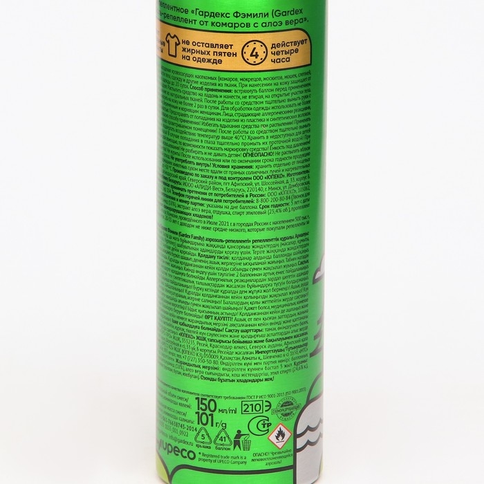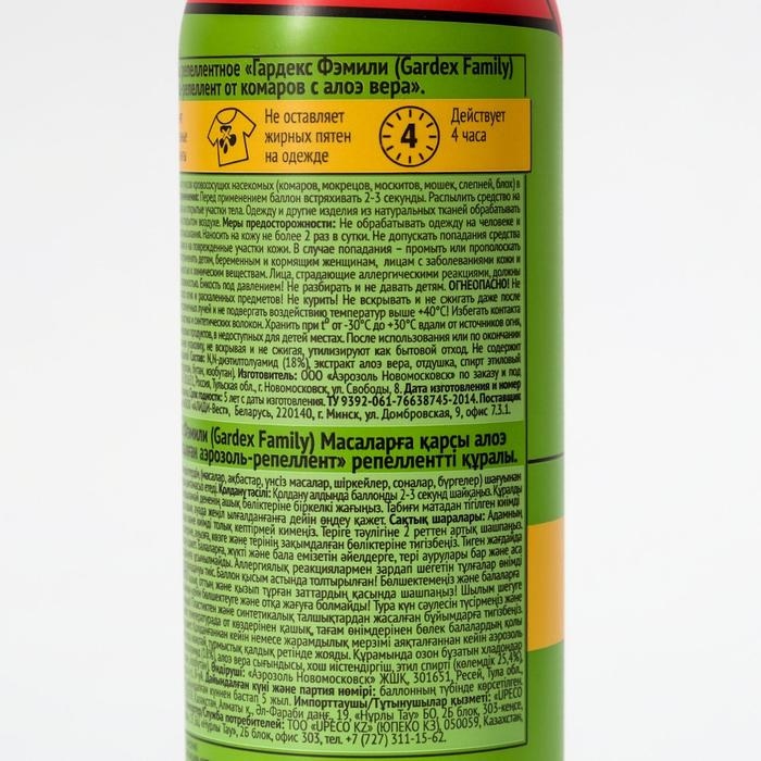 Аэрозоль репеллентный от комаров "Gardex Family", с алоэ вера, 150 мл