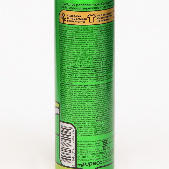 Можно наносить на кожу и на одежду, не оставляет жирных следов и пятенВремя действия: до 4 часов.Способ применения: перед применением баллон встряхивать 2-3 секунды. Распылить средство на ладонь и нанести, не втирая, на открытые участки тела. Одежду и другие изделия из натуральных тканей обрабатывать до легкого увлажнения на открытом воздухе.Меры предосторожности: не обрабатывать одежду на человеке и не надевать ее до полного высыхания. Наносить на кожу не более 2 раз в сутки. Не допускать попадания средства в глаза, рот, органы дыхания и на поврежденные участки кожи. В случае попадания – промыть или прополоскать водой. Не рекомендуется применять детям, беременным и кормящим женщинам, лицам с заболеваниями кожи и повышенной чувствительностью. Лица, страдающие аллергическими реакциями, должны применять продукт с осторожностью. Емкость под давлением! Не разбирать и не давать детям. ОГНЕОПАСНО! ТОКСИЧНО! Не распылять вблизи открытого огня и раскаленных предметов! Не курить! Не вскрывать и не сжигать даже после использования! Беречь от солнечных лучей и не подвергать воздействию температур выше +40°С Избегать контакта средства с изделиями из пластика и синтетических волокон. После использования или по окончании срока годности аэрозольную упаковку, не вскрывая и не сжигая, утилизируют как бытовой отход. Не содержит озоноразрушающих хладонов!Хранение: хранить при t⁰ от -30°С до +30°С вдали от источников огня, отдельно от лекарств и пищевых продуктов, в недоступных для детей местах.Состав: N,N-диэтилтолуамид - 20%, спирт этиловый, пропиленгликоль, отдушка, бутан, изобутан, пропан.Срок годности: 5 лет с даты изготовления.