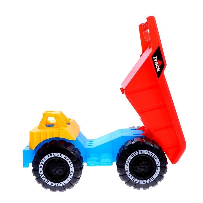 Благодаря большим колёсам самосвал удобно катать по песчаной поверхности. В кузов машины малыш может набрать воды, чтобы смачивать песок, а может перевозить в нём строительный материал.