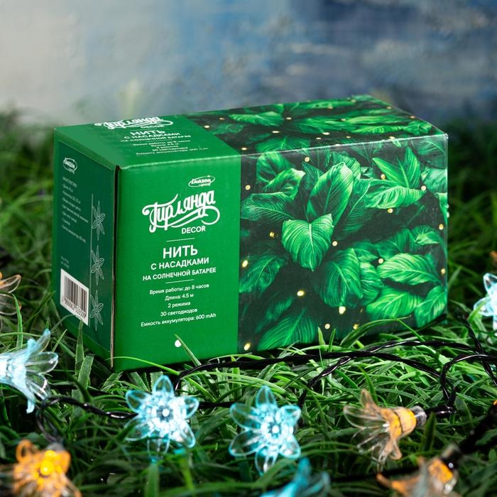 Гирлянда «Нить» 4.5 м с насадками «Цветы», IP44, тёмная нить, 30 LED, свечение мульти, 2 режима, солнечная батарея