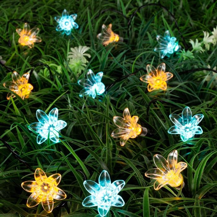 Гирлянда «Нить» 4.5 м с насадками «Цветы», IP44, тёмная нить, 30 LED, свечение жёлтое/аквамарин, 2 режима, солнечная батарея