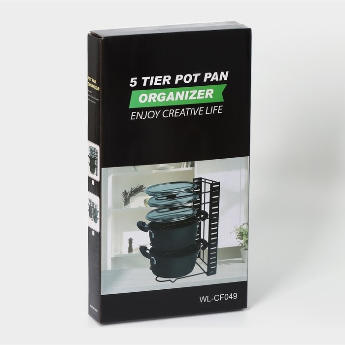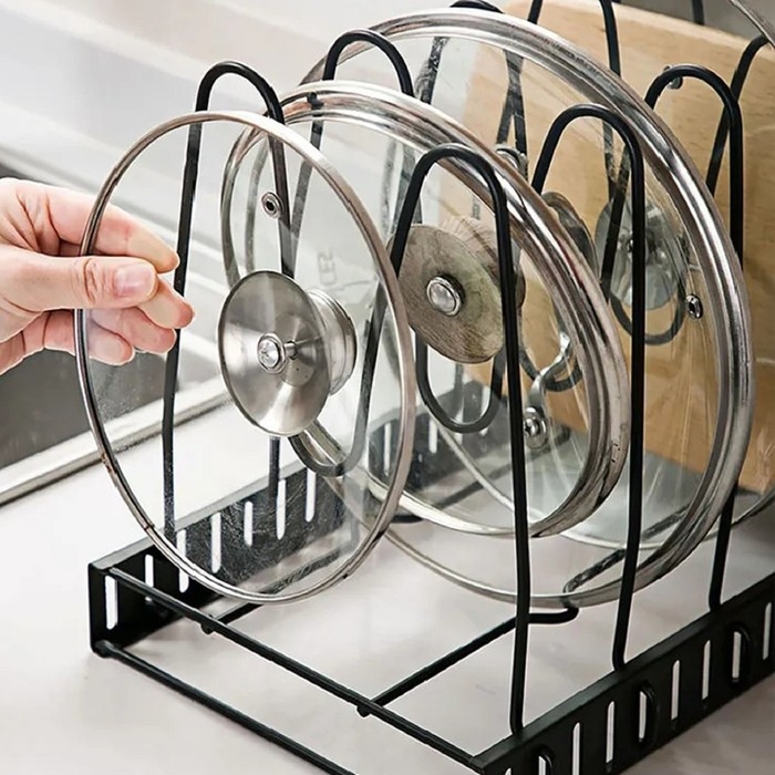 Удобная подставка предназначена для экономии места на кухне, а именно компактного хранения сковородок и крышек в одном месте.