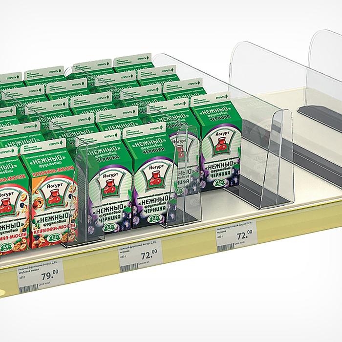 Применяется при выкладке товаров средних и крупных размеров. Ограничитель предотвращает падение товара, расположенного у преднего края полки. Материал: прозрачный ударопрочный пластик. Высота ограничителя 150 мм.