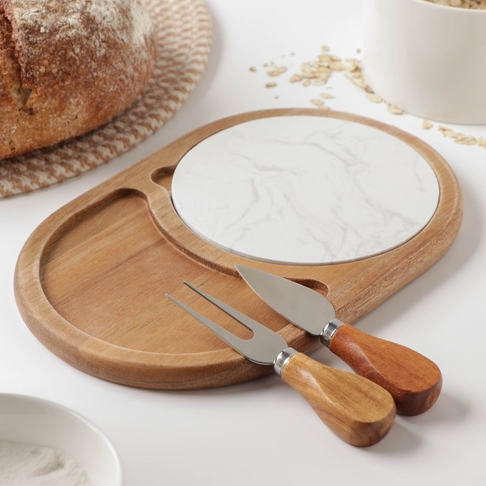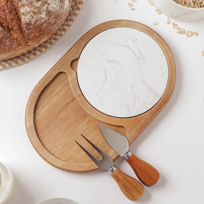 Набор для подачи сыра «Мрамор», 2 ножа, доска, 24,5×16×1,5 см, акация