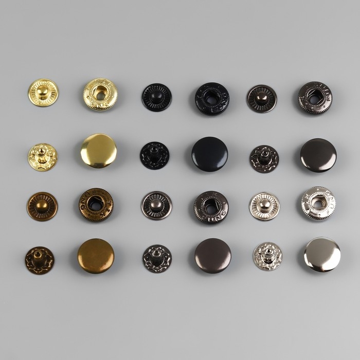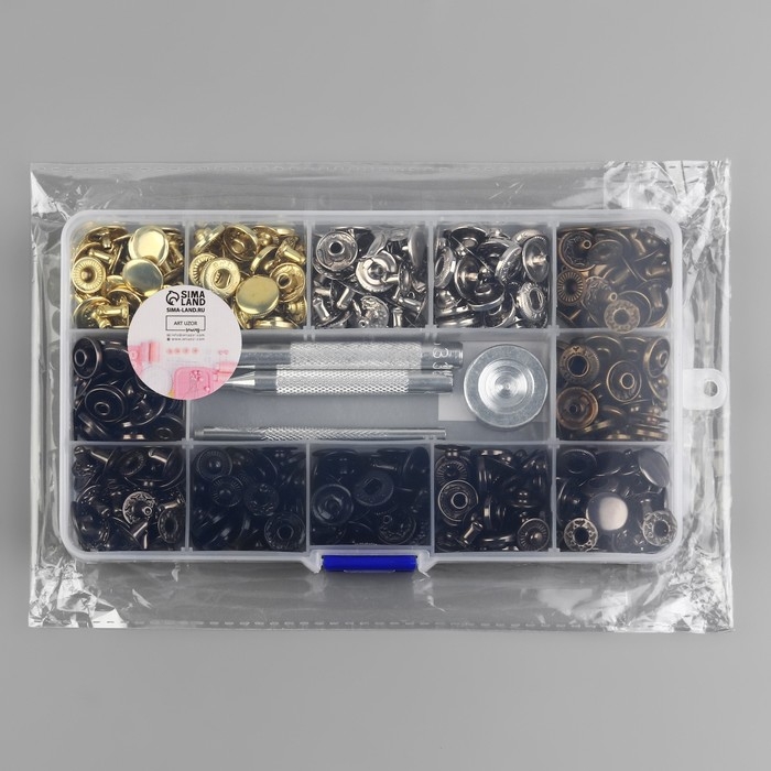 В наборе: 120 кнопок шести разных цветов, d = 12,5 мм; установщик; пластиковый органайзер для хранения.