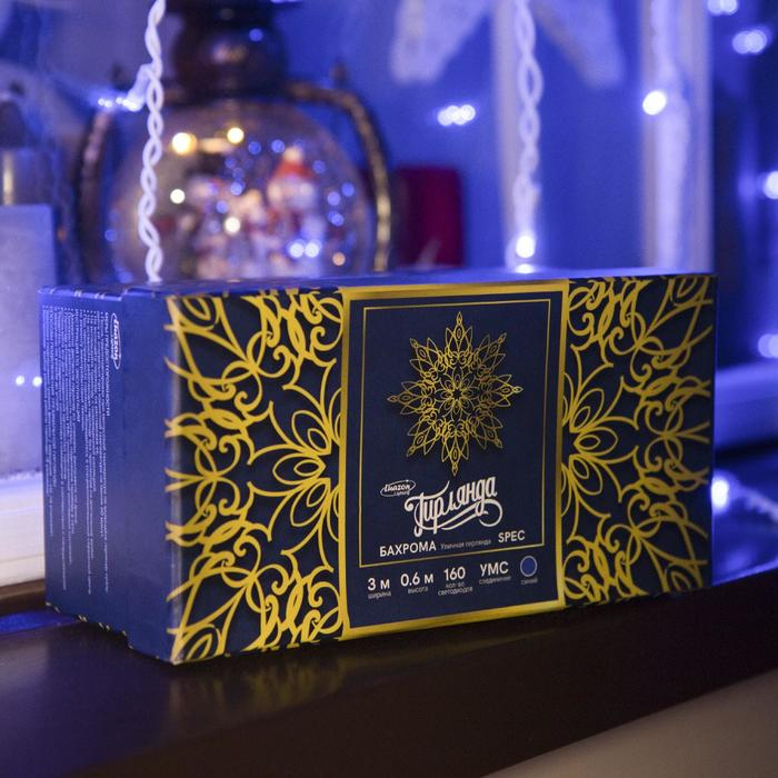 Гирлянда «Бахрома» 3 × 0.6 м, IP44, УМС, белая нить, 160 LED, свечение синее, 220 В
