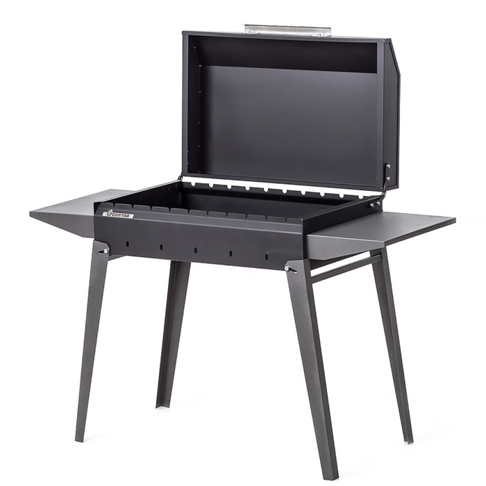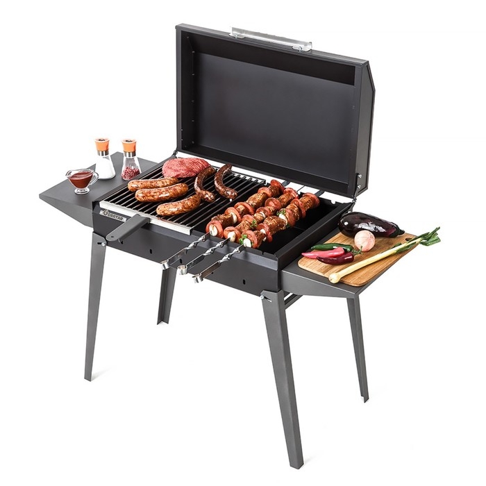 Старшая модель серии, комплектуется крышкой барбекю. Компактный и надёжный. В сложенном виде удобно хранить и перевозить.Выдерживает дровяную растопку. Складные ножки. Две полки для размещения продуктов и инструментов. Крышка с термоизолированной ручкой.