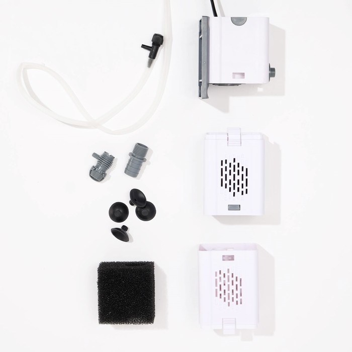 Фильтр имеет две секции, очищение воды происходит с помощью губок, которые пропускают воду через фильтрующий материал, удаляя из нее загрязнения и остатки пищи.