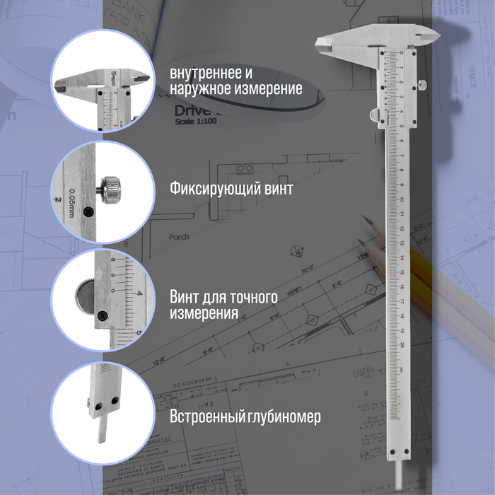 Штангенциркуль ТУНДРА, металлический, с глубиномером, цена деления 0.05 мм, 200 мм