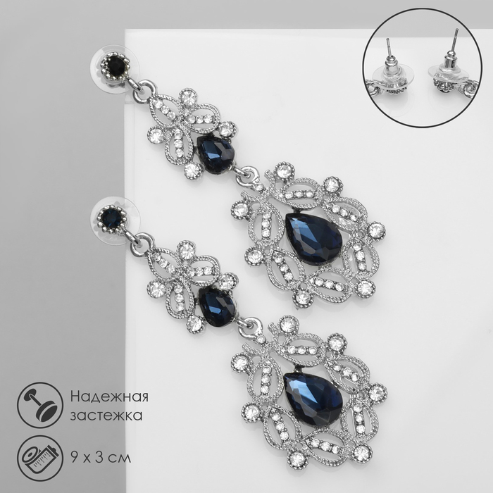 Серьги висячие со стразами «Грация» резная, цвет синий в серебре, 9 см