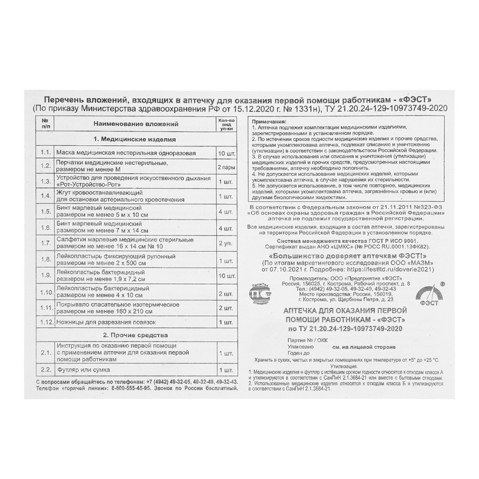 Аптечка для оказания первой помощи работникам "ФЭСТ", приказ 1331н, футляр 8М
