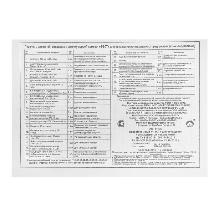 Аптечка первой помощи "ФЭСТ" для оснащения промышленных предприятий, футляр-полистирол, №7.1