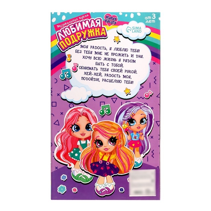 - Куколка воспроизводит одну песенку — «Моя радость, я люблю тебя». Для работы необходимы 3 батарейки типоразмера LR44, входят в комплект.
