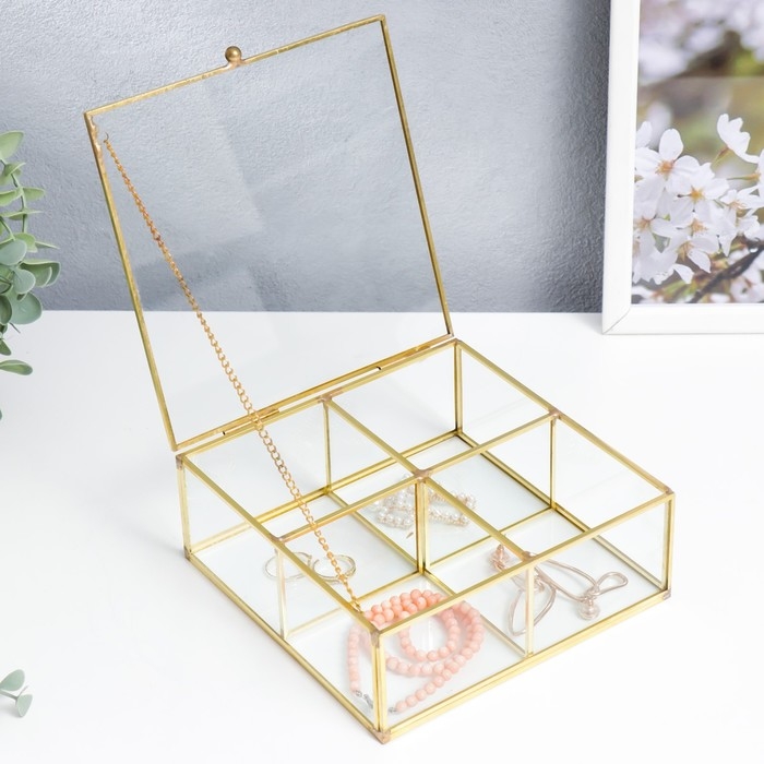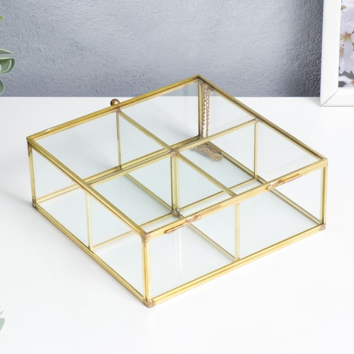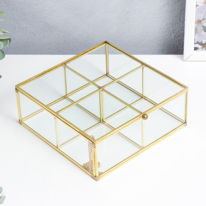 Шкатулка стекло с металлическим каркасом с делениями"Квадрат с гранями" 7х16х16 см