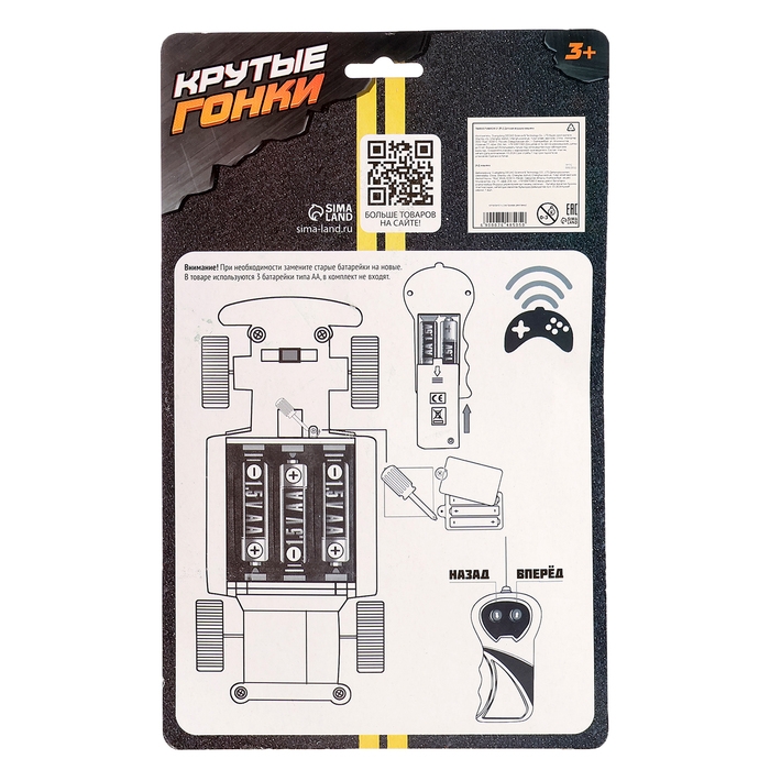 Машина функционирует от 3 батареек типа АА, пульт — от 2 АА. Элементы питания не входят в комплектацию.
