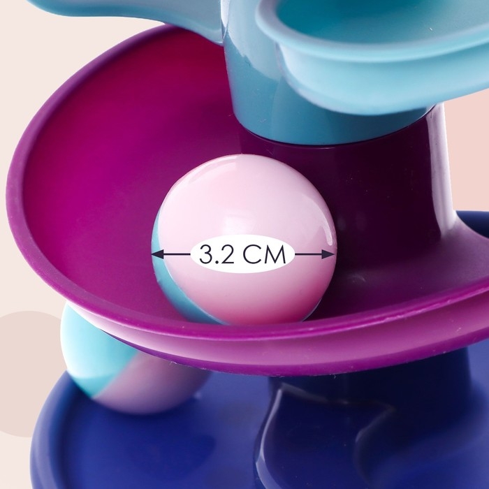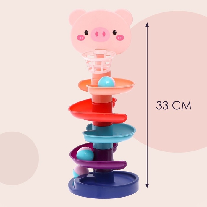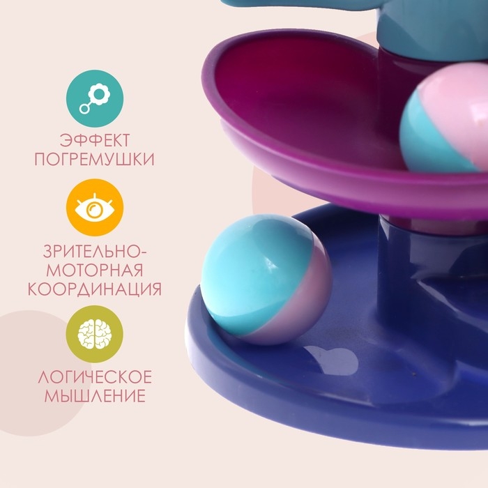 Малыш будет бросать разноцветные шарики в корзинку, и следить, как они скатываются с горки по спирали.