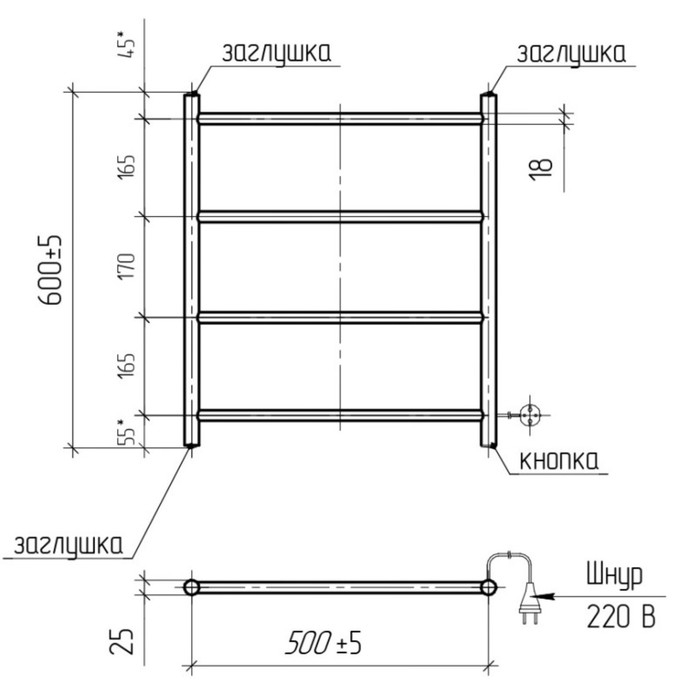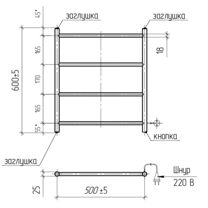 Полотенцесушитель электрический ТЕРА "Электра", 500х600 мм, 4 перекладины, черный