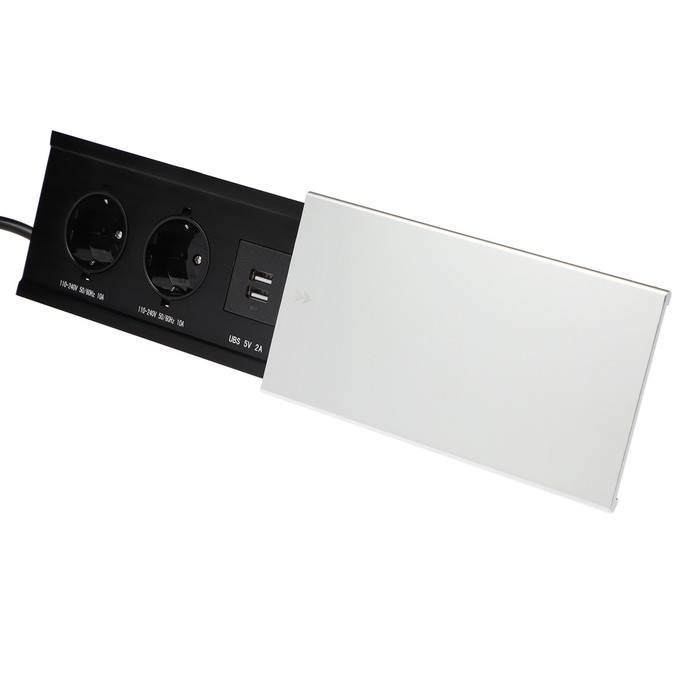 Блок розеточный в стол, сдвижная крышка, 10А, 2 розетки, 2xUSB, 2A, провод 1.8 м, серебр.