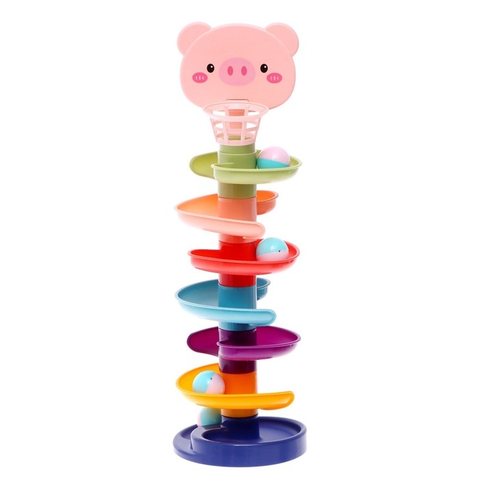 Малыш будет бросать разноцветные шарики в корзинку, и следить, как они скатываются с горки по спирали.