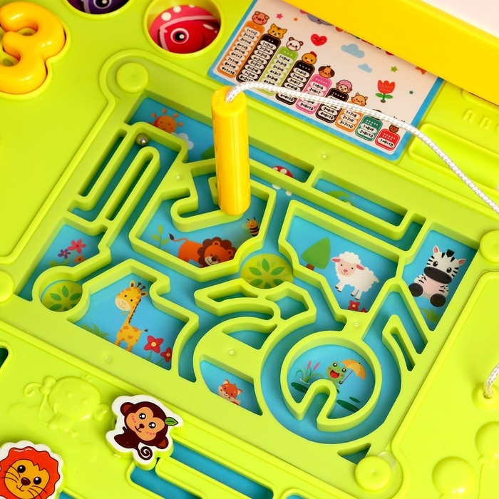- Есть настольные развивающие игры: «Ходилка» (кубик входит в комплект), «Сортер» (нужно сопоставить форму отверстий с фигурками цифр), «Рыбалка» (удочка и рыбки на магните), «Лабиринт» с магнитной ручкой.