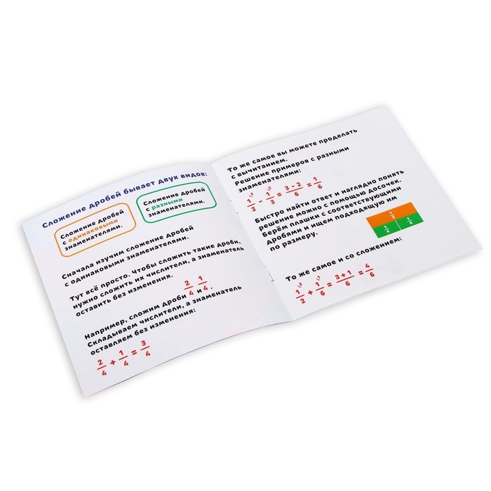 - Решайте примеры на сложение и вычитание дробей и представляйте результат с помощью досочек из набора.