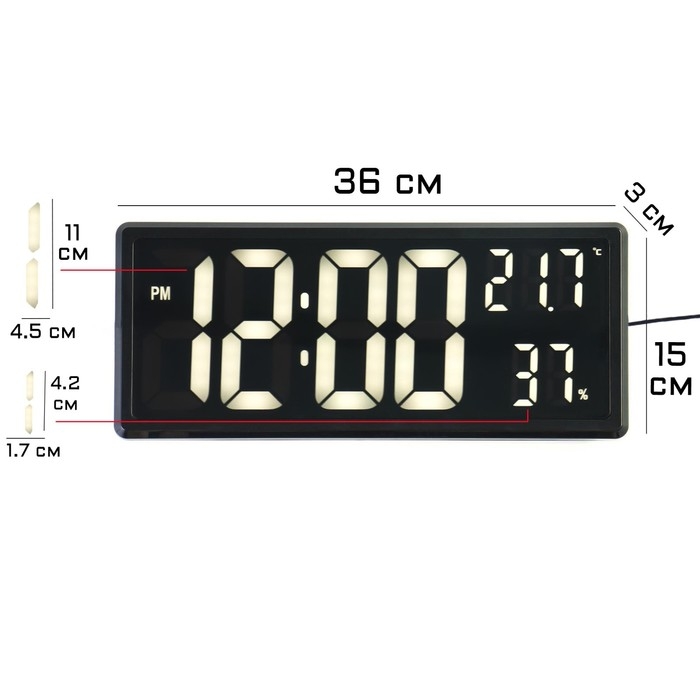 Часы электронные настенные, календарь и термометр, 36.2 х 15.5 см, белые цифры 10 х 4.5 см 1076627