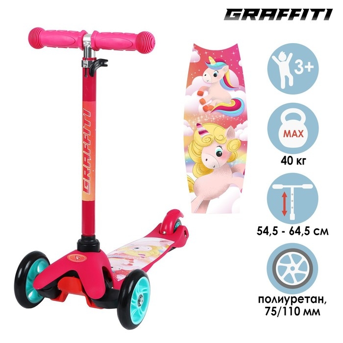 Самокат GRAFFITI «Единорожки», колёса PU 110/75 мм, ABEC 7, цвет розовый