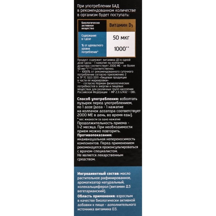 Состав: масло растительное рафинированное, аротатизатор натуральный, холекальциферол (витамин Д3 вегетарианский).