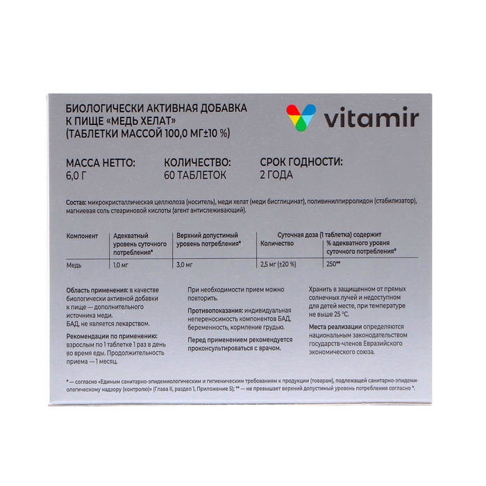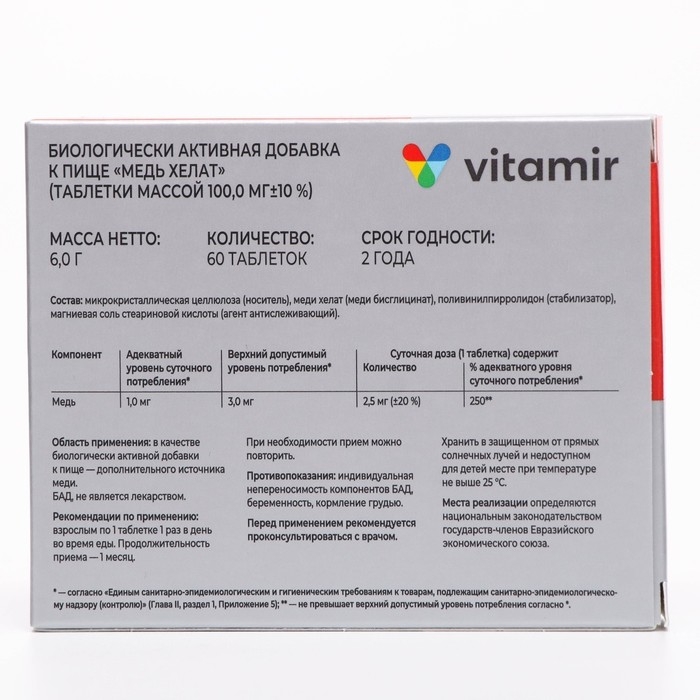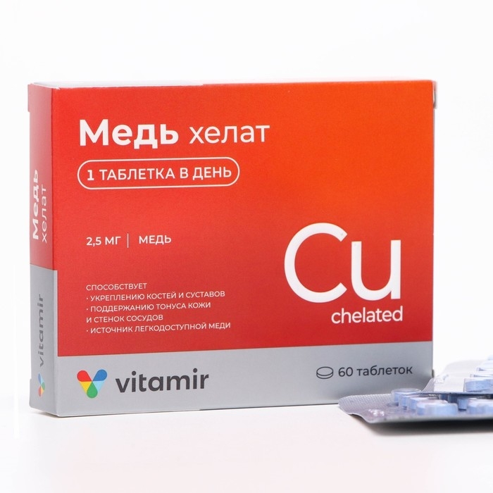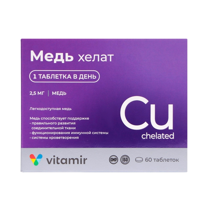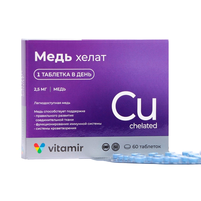 Биологически активная добавка к пище, дополнительный источник меди, необходимой для работы иммунной системы и правильного протекания обменных процессов. Медь – жизненно важный микроэлемент для организма человека, который влияет на активность витаминов, гормонов и ферментов. Она участвует во многих процессах обмена веществ, способствует поддержанию иммунной системы организма, повышая его сопротивляемость инфекциям, обеспечивает усвоение железа. Способствует укреплению костей и суставов, поддержанию тонуса кожи и стенок сосудов.