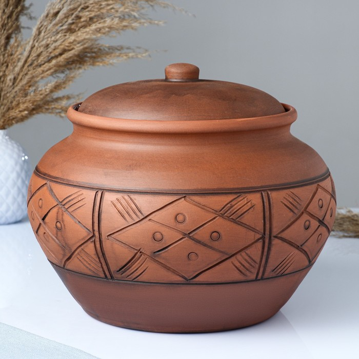 Жаровня «Орнамент» от Кунгурской керамики — керамический горшок с глазурью «молочение» и вместительностью 7 литров. Подходит для запекания, томления и хранения блюд в холодильнике. Круглая форма, плотная крышка и декоративный узор делают её практичной и выразительной на кухне или на праздничном столе.