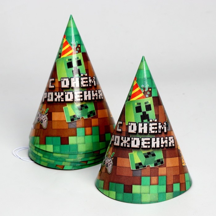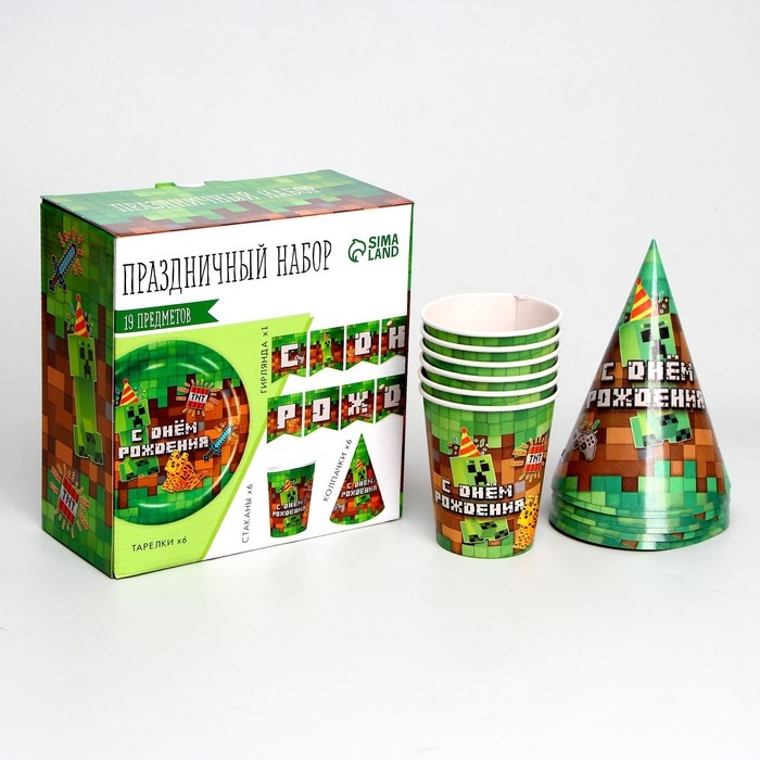 Набор бумажной посуды одноразовый С Днём Рождения», пиксели, 6 тарелок, 6 стаканов, 6 колпаков