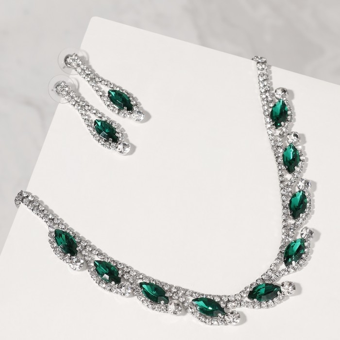 Набор 2 предмета: серьги, колье «Листопад» утончённый ромб, цвет бело-изумрудный в серебре, 32 см