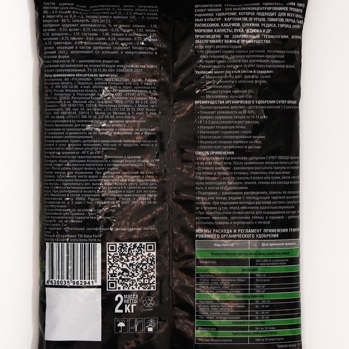 Удобрение органическое Bona Forte, "Супер Овощи", с цеолитом и аминокислотами, 2 кг