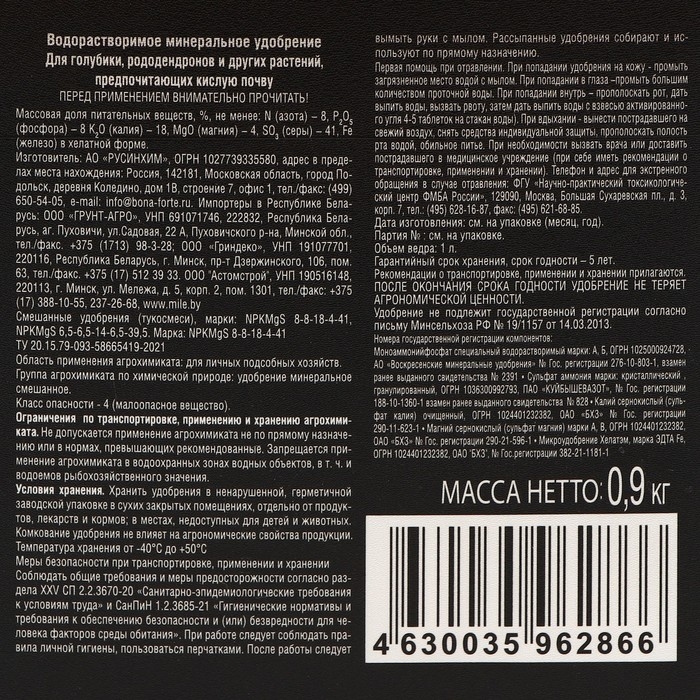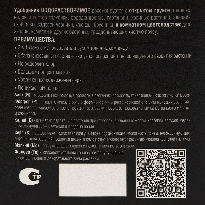 Водорастворимое минеральное удобрение для голубики, рододендронов и других растений, предпочитающих кислую почву.