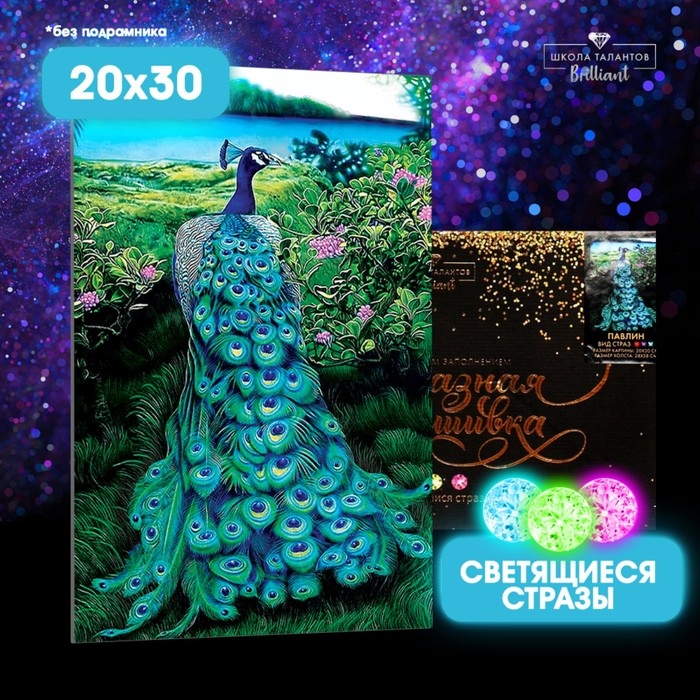 Алмазная мозаика с полным заполнением со светящимися стразами на холсте «Павлин», 20 х 30 см