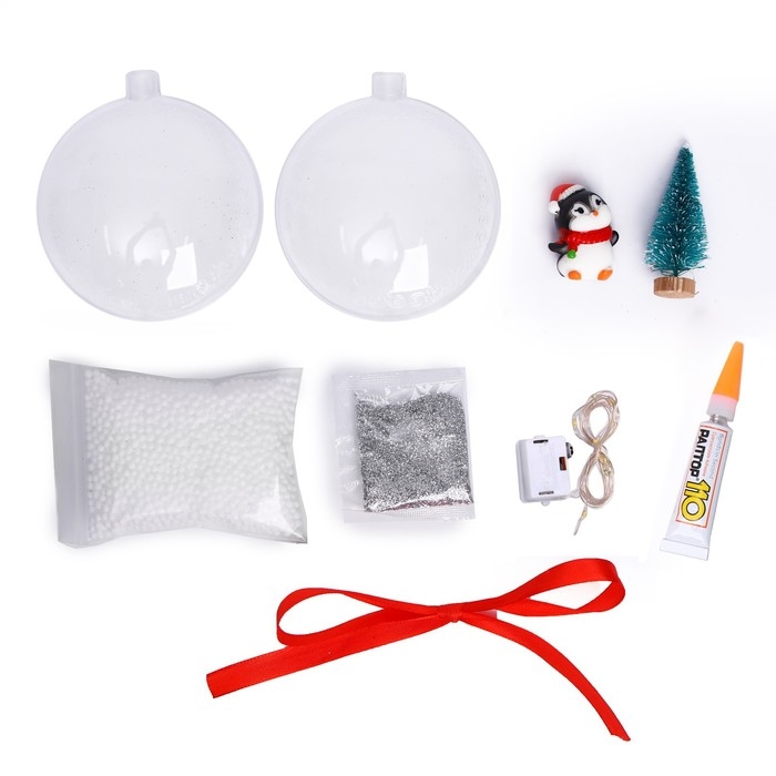 В наборе: ёлочный шар-основа, фигурки, гирлянда, декор.