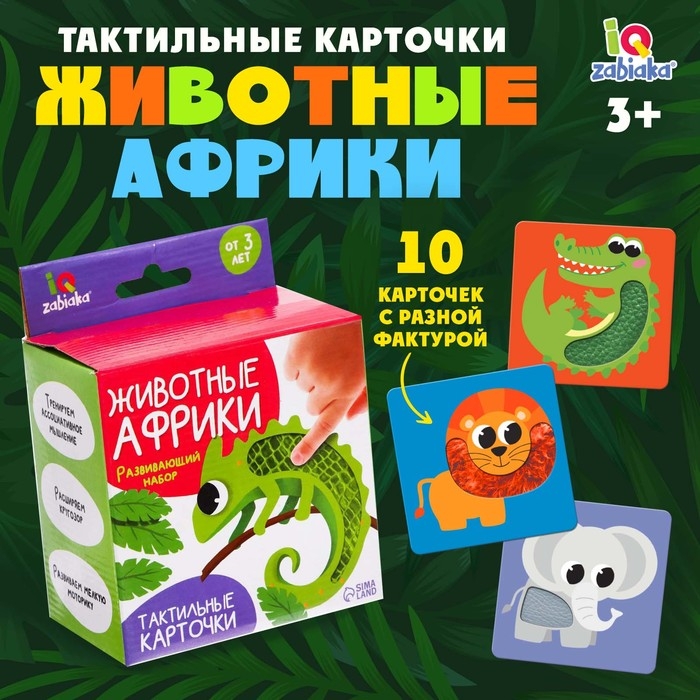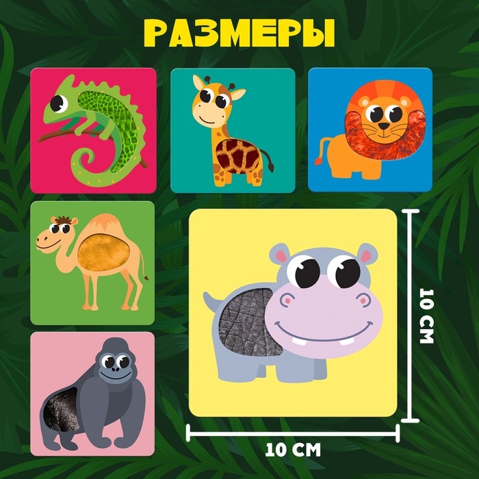 В развивающем наборе «Животные Африки» есть множество тактильных элементов на карточках с животными. Они представлены вкладками, соответствующими поверхности тела каждого зверька.