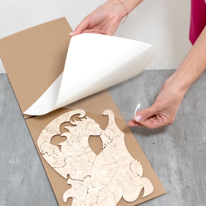 - Тщательно разгладьте плёнку по пазлу, чтобы она идеально приклеилась и внутри не осталось пузырьков воздуха.