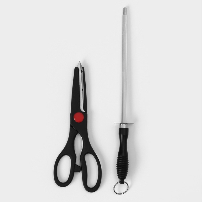 Набор ножей кухонных на подставке Доляна «Кронос», 7 предметов: 5 ножей, мусат и ножницы, цвет чёрный
