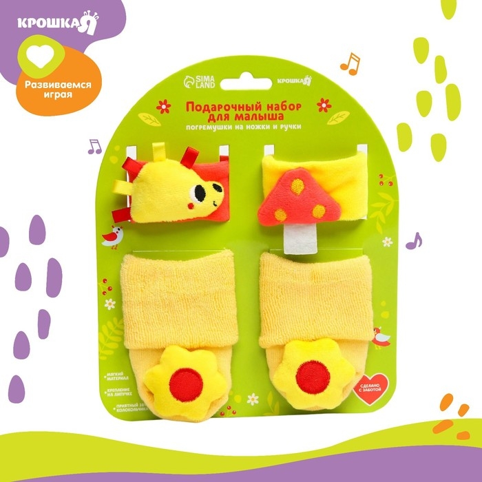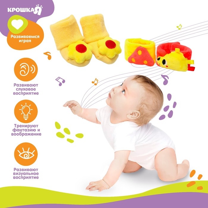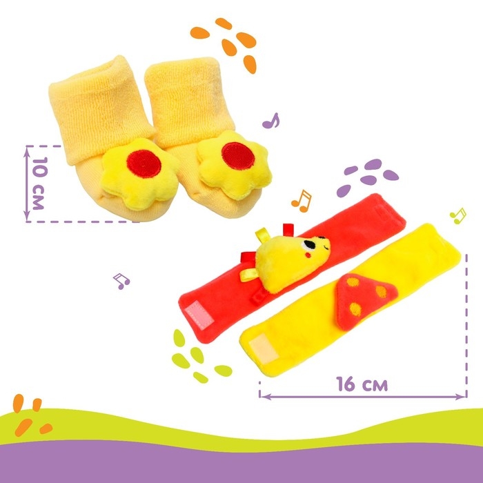 - Множество развлекательных возможностей: Наш набор включает в себя яркие и забавные браслетики и носочки-погремушки, которые захватят внимание вашего малыша. Они оснащены погремушками, которые издают звуки при движении, стимулируя развитие его слуховых и моторных навыков.