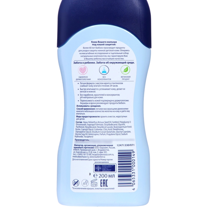 Молочко детское для чуствительной кожи Bubchen с маслом карите и пантенолом, 200 мл