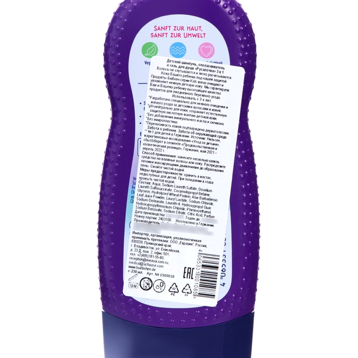 Мягкий уход с головы до пяточек - все в одном продукте. Гель для душа - чрезвычайно мягкое очищение, благодаря растительным моющим субстанциям и провитамину В5. Шампунь - укрепляет волосы, благодаря протеинам пшеницы. Бальзам - облегчает расчесывание длинных и непослушных волос. Использовать для детей с 3-х лет.