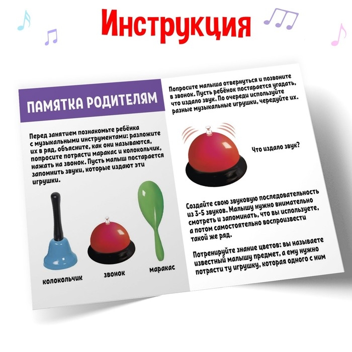 - Попросите кроху потрясти маракас и колокольчик, нажать на звонок. Пусть малыш постарается запомнить звуки, которые издают эти игрушки.