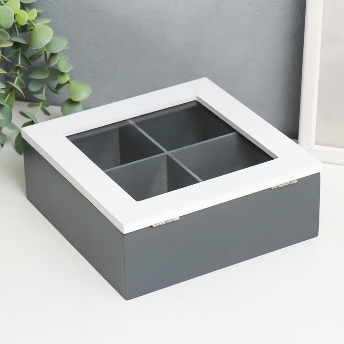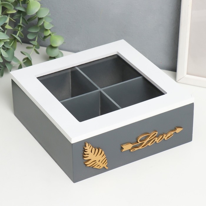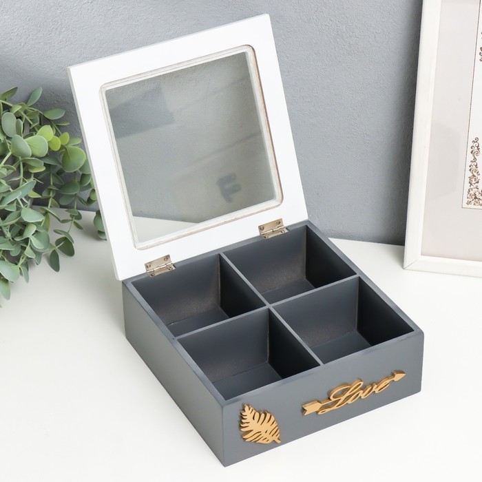 Шкатулка дерево, стекло с делениями "Лист папоротника" бело-серая 18х18х7 см