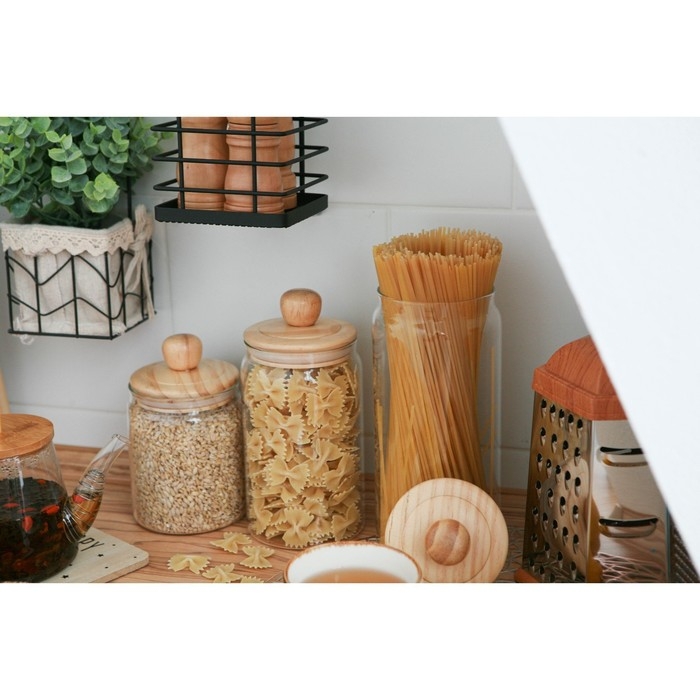 Банка для сыпучих продуктов изготовлена из стекла. Имеет плотно закрывающуюся крышку, которая защищает продукты от влаги и посторонних запахов. В ёмкости удобно хранить крупы, специи, макаронные изделия, сахар, муку и бобовые.