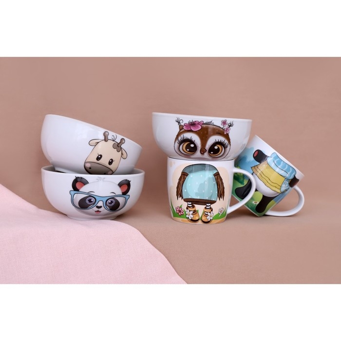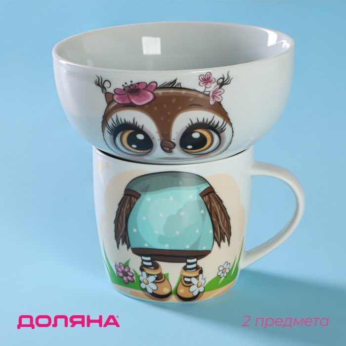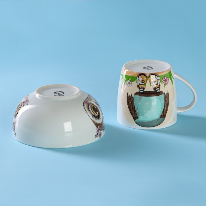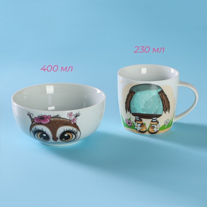 Набор детской посуды из керамики Доляна «Совенок», 2 предмета: кружка 230 мл, миска 400 мл, цвет белый