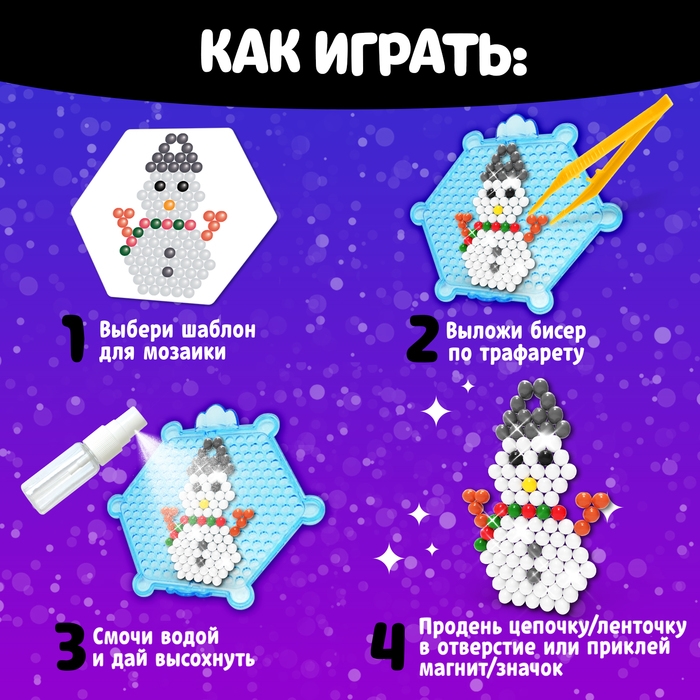 Аквамозаика от торговой марки «Эврики» скрасит дни в ожидании Нового года и поможет весело и с пользой провести время. Ребёнок соберёт 10 объёмных фигурок из шариков-пикселей, потренирует мелкую моторику и внимание.