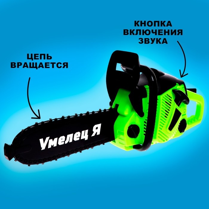 - Эта игрушка совсем как настоящая пила и при этом абсолютно безопасная. Нажмите на кнопку, и цепь начнёт вращаться и издавать характерные звуки.
