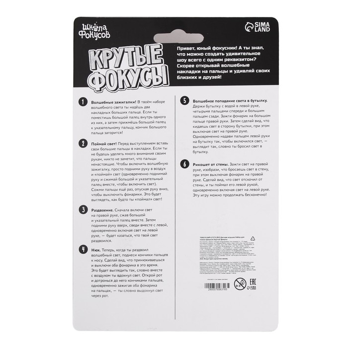 - Фокус «Волшебные зажигалки»: возьмите из набора два накладных больших пальца и поместите один из пальцев внутрь накладного, а затем прижмите большой палец к указательному — кончик искусственного пальца загорится!