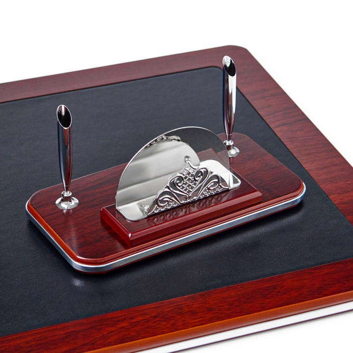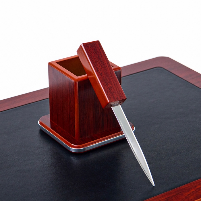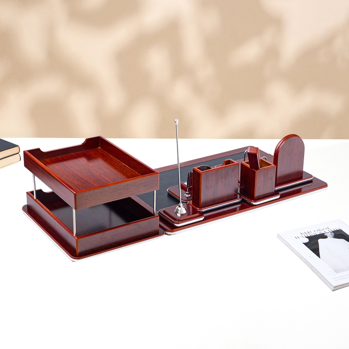 Компактный настольный набор поможет избежать хаоса на рабочем месте. Храните в нём канцелярские принадлежности или другие мелочи, чтобы правильно организовать пространство. К тому же изделие имеет минималистичный дизайн и выполнено под дерево, поэтому оно украсит собой любое место как декоративный элемент.
